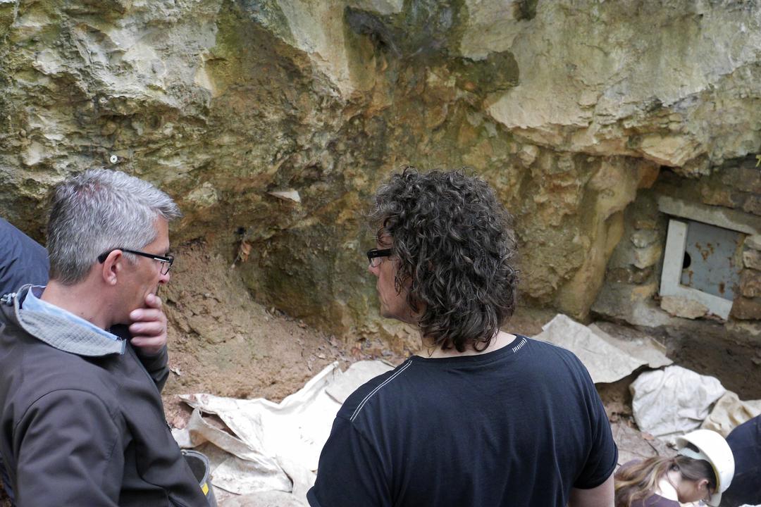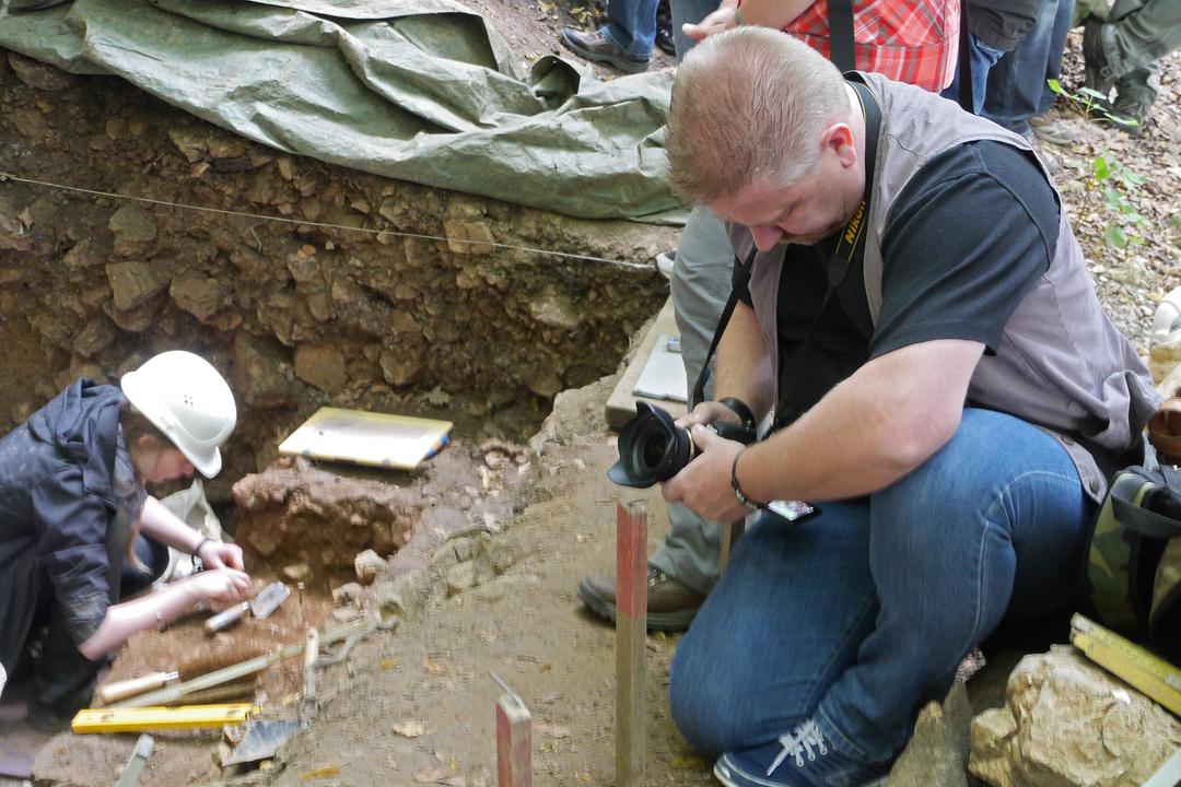 Dank der Initiatoren einer Facebook-Gruppe mit dem schönen Namen „Hagener für Kultur, Kunst und Geschichte(n) aus Hagen“ machte sich gestern eine kleine Gruppe Interessierter auf den Weg nach Holthausen, um in Nähe der Hühnenpforte, an einer Stelle, wo wir als Kinder durch den Wald gestreift sind, nicht zuletzt auch, um „Maikrabbazen“ zu suchen, die gerade laufenden Ausgrabungen an der Blätterhöhle zu besichtigen. Vielen Dank an Thorsten Eisermann und Dr. Ralf Blank (die heftig fotografierenden Herren auf den ersten beiden Bildern), dass sie das für uns möglich gemacht haben und herzlichen Dank auch an Dr. Jörg Orschiedt (sechstes Foto) für die überaus überzeugende und lebendige Schilderung dessen, was bisher erforscht wurde (unten gibt es dazu einige weiterführende Links; ich weiß jetzt zum Beispiel, dass sämtliche Kühe auf all unseren Weiden -vorletztes Bild- von einer kleinen 1.000er Population anatolischer Kühe abstammen). Zwei Überraschungsgäste aus Kommunal- und Bundespolitik, „parteiisch“ sowie „unparteiisch“ waren auch mit von der Partie. Zwei Gruppenmitglieder besaßen den Mut, in die Höhle zu robben, wie man sieht. Hut oder besser Helm ab! Eine ganz tolle Veranstaltung mit tollen Menschen, die sich am Ende ein angemessenes Kaltgetränk verdient hatten.